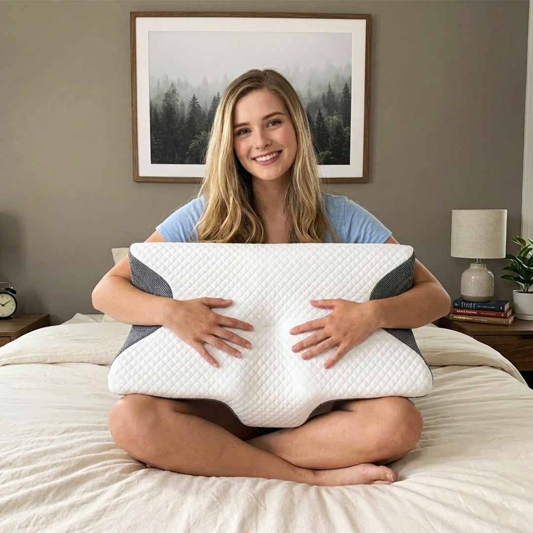 It’s an ergonomic contour pillow designed to support your neck and align your spine while you sleep. This helps reduce strain, improve comfort, and promote deeper, more restful sleep.